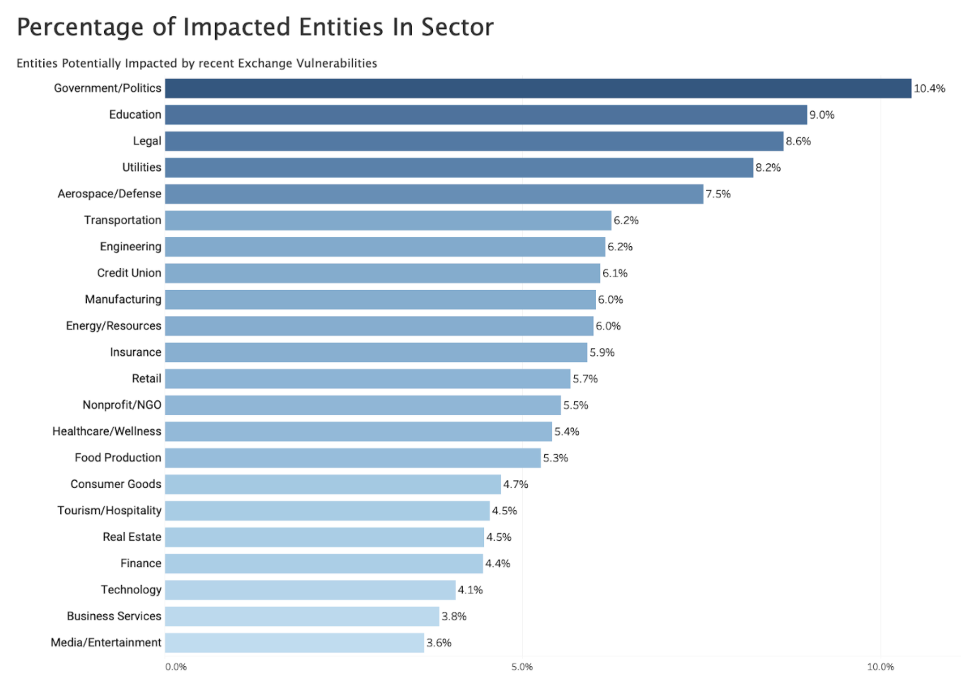Shortly after Microsoft’s announcement, Bitsight observed at least 30,000 global organizations potentially vulnerable to exploitation. Bitsight examined the prevalence of organizations running Microsoft Exchange Server by sector, finding that the Government sector has the highest prevalence of Microsoft Exchange among all sectors: